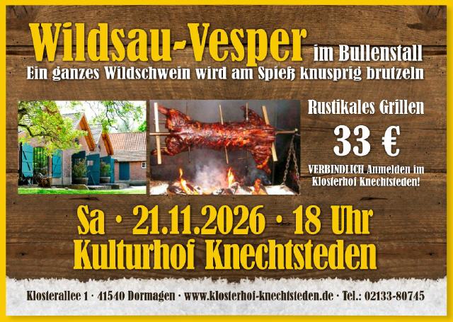 Ein ganzes Wildschwein wird am Spieß knusprig brutzeln und mit leckeren Beilagen die Gaumen verwöhnen. Und damit der nicht trocken wird, werden dazu allerlei Getränke gereicht; mit dabei sind Früh Kölsch, Glühwein, Wein, Softdrinksund natürlich unser Knechtstedener Schwarzes.