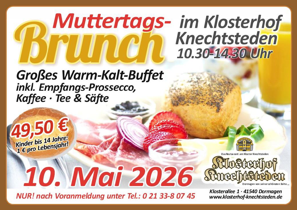 Ein großes warmes und kaltes Buffet inklusive Prosecco-Empfang erwartet Sie am 10. Mai 2026 von 10:30 bis 14:30 Uhr. Kaffee, Tee und Säfte sind unbegrenzt inklusive – perfekt für einen entspannten Sonntag im idyllischen Klosterambiente nahe Dormagen.